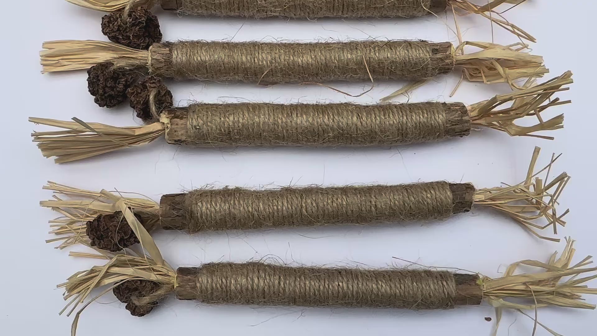 Our sticks are handcrafted with 100% natural silvervine, wrapped in soft cotton rope and adorned with raffia tassels. Each toy is unique and built to last.